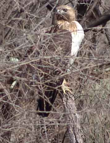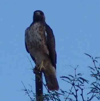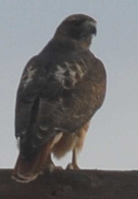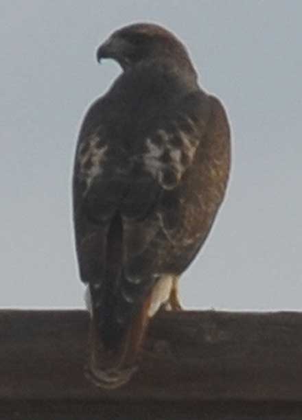 Below, two good views of a sitting Red-Tail in the evening light of November 9, 2007. Here the redness of the tail is quite clear. (Particularly note the diagnostic white-speckled pattern on the scapulars.) (Click on each image to enlarge it.)