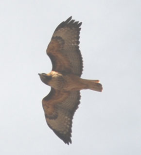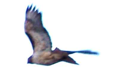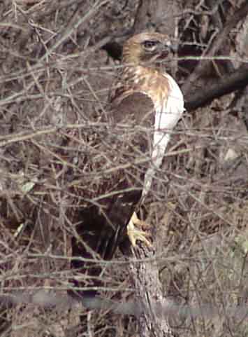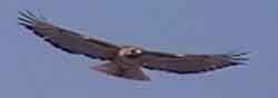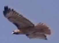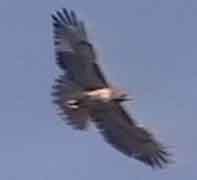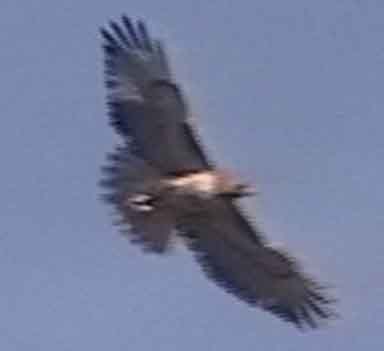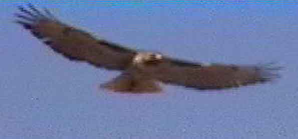 While Red-Tails usually maintain considerable distance from humans, occasionally -- as in late May 1998 -- one will threaten human observers who intrude upon its local province. This one below circled the Rabbit Ears Saguaro Hill in Lower Hot Springs Canyon several times, where a Saguaro Juniper photographer was standing while filming photostation images of the canyon. It moved gradually closer in circles, and finally (at quite close range) buzzed the cameraman, who held his mid-90s-era camcorder protectively over his head. The bird uttered a piercing keeeer! cry as it passed. The image at right was the last "still" obtainable before the attacker swooped in, and then flew smartly away and out of sight. (You can click on each image to enlarge it, though these are crummy images.)