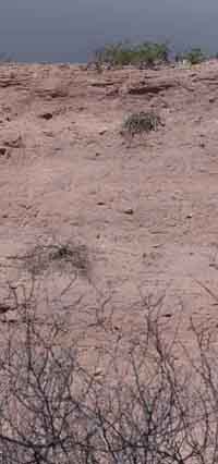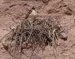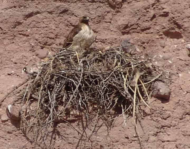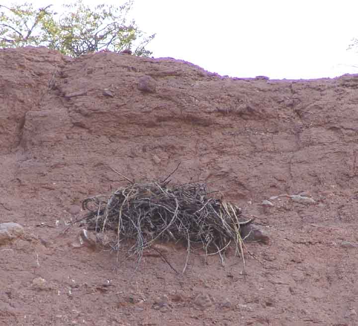 At left, a large hawk's nest in Sierra Blanca Canyon Wash viewed in March 2005. Note that the nest -- the mass near the top of the cliff (about 60 feet high above the wash), imitates the shape of the cliff-hanging shrub down below it. (Click on the image for a closeup of the nest.)