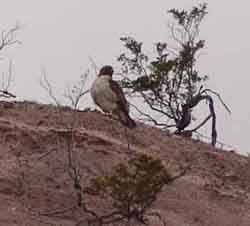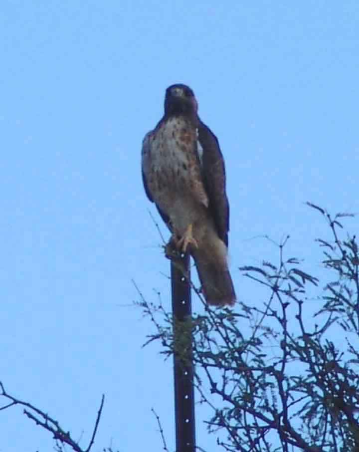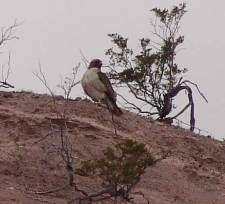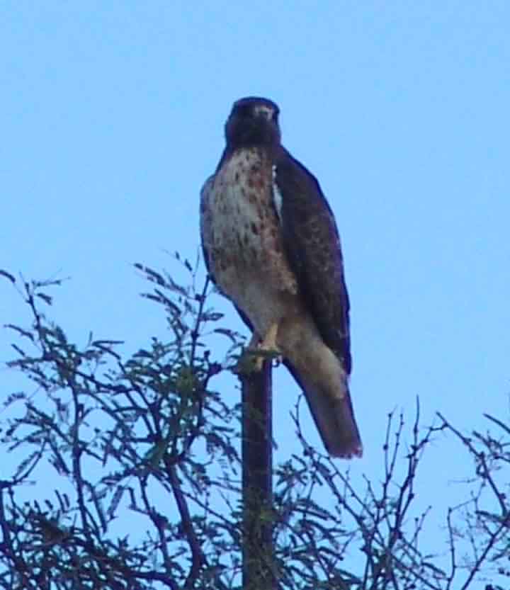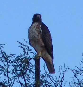 We encountered this bird below tearing apart a jackrabbit (probably a fresh road-kill) along Cascabel Road in January 2005. As we pulled the truck to a stop right beside it, the bird reluctantly flew off (only then displaying its markedly red tail feathers), but only went a short distance, to land on a mesquite branch across the road, where it waited at about eye-level while we got these photos. It had a companion also watching from atop a power pole not far away. (Click on each image to enlarge it.)
