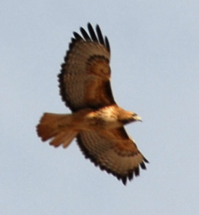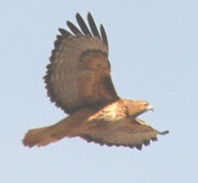 Below, three views of an adult Red-tailed, having just launched from atop a power pole near milepost 18 on the Cascabel Road February 20, 2008. The middle photo especially shows the characteristic wing-feather color patterns and the broad wing shape of this marvelous raptor. (Click on each image to enlarge it.) Compare the red-tail's broad wings in flight with those of the Ferruginous Hawk.
