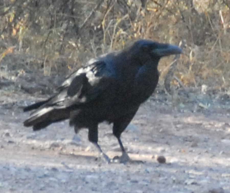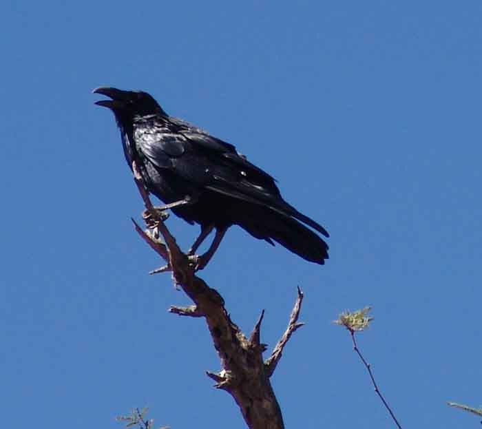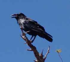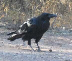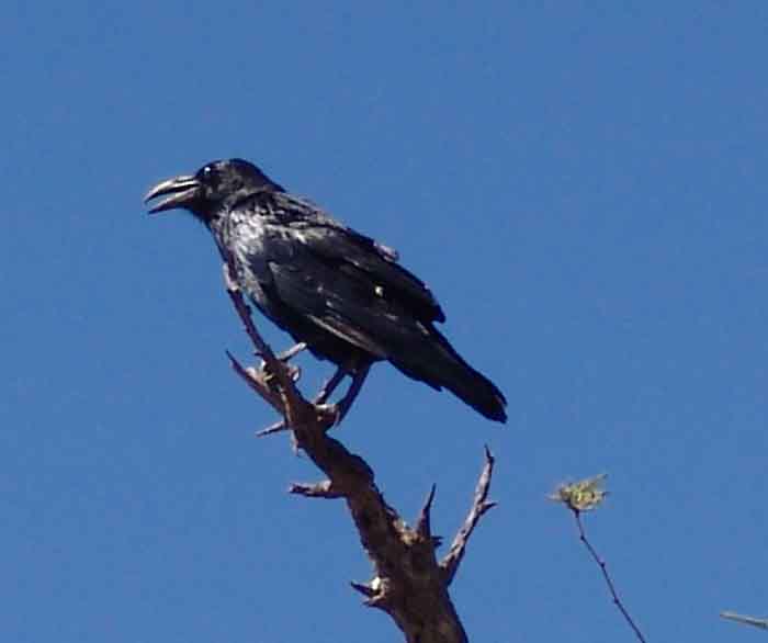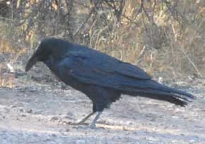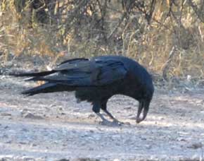 Crows and ravens are especially noted for their intelligence, competing on some tests as well as monkeys, and ravens in particular have demonstrated abilities to "show true insight when solving problems, without prior trial-and-error learning" (Ibid., p. 412).Their brain mass/body mass ratio is more like that of primates than those of most other birds. They are opportunists who will take advantage of any available food source, and like the Jays they store excess food, remembering numerous cache locations. Although we see ravens frequently on most parts of our Saguaro Juniper lands, and while they congregate in very large numbers in the wintertime in places like the Pecan Orchards near Teran Wash along the San Pedro River, they are sufficiently wily that we are seldom able to get decent photographs of them -- they seem to fly away just when someone raises a camera, even at rather distant range. A disturbingly "humanoid wiliness" has been established for them by scientific observers of this bird, an actor who -- like a chimpanzee -- is able to grasp the principle of "mind reading", sensing that what another creature knows is not the same as what I know, and then modifying my own behavior in light of that knowledge. In other words, ravens can and do engage in active deception of others who are present in their situation.