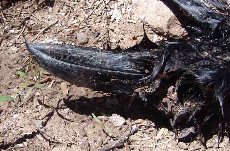 Like vultures, in flight ravens show slotted wingtips, a feature which assists them in soaring as they travel long distances in search of carrion. We have seen an individual raven harrassing a Gila Monster which was crossing a dirt road, and another one "stalking" a Barn Owl which must have been seriously injured, since it flew only short distances away from a human observer in broad daylight. They possess a serious weapon -- a large and strong beak. Witness this example from one we found drowned near Hot Springs Canyon Wash: (click on the image for enlargement)