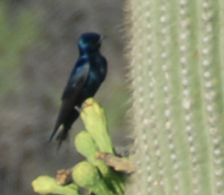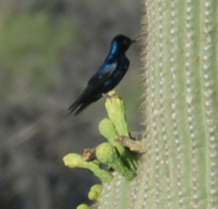 All of the images above are of the Purple Martin (Progne subis), the largest of North American Swallows. They are fairly common here, appearing in the summer and breeding in our area. The all-black male looking out over the agave blossoms was surveying Sierra Blanca Canyon Wash in July of 2004.
