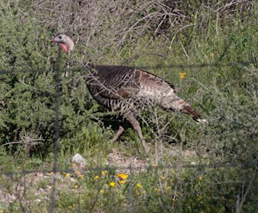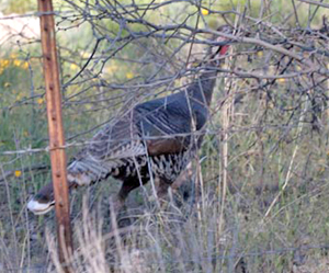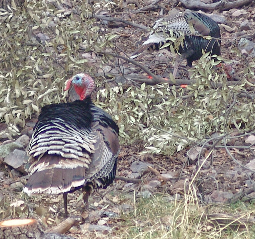 To our knowledge, wild turkeys have not been seen along the San Pedro River near Hot Springs Canyon for quite some time (maybe long-resident locals can inform us better), but Jim Flood caught these images of one above, near the river in March of 2010. So perhaps a population is moving downriver from the vicinity of Ramsey Canyon, where we photographed members of a well-known flock there (below) in March of 2009:
