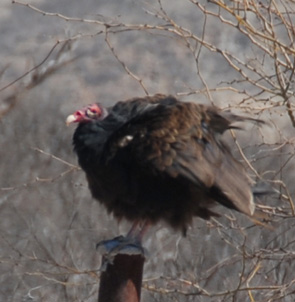 Though we have the Black Vulture in our area as well, the Turkey Vulture is our much more common of these two summer visitors. A large bird (some 26" long, weighing around 4 lbs, with a wingspan of about 6 feet), it has a distinctively red head in the adult and a mainly brownish body, as evident in the images above and below. The Black Vulture (Coragyps atratus) as its name implies is all-over black to gray.