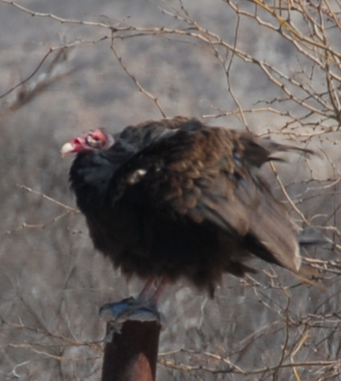 This image nicely shows the boundary between the fully-feathered lower neck and the completely bald head (an antiseptic adaptation for eating bacteria-infested meat), as well as the characteristic yellow beak, the very large nostril, and the relatively small eye compared with those of raptors, though Turkey Vultures do have good vision as well as excellent powers of smell. (Click on the image for a close-up of the head.)