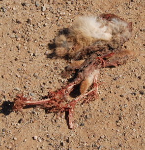 Below, one member of a flock of about 20 vultures and a handful of Common Ravens were encountered on the Cascabel Road near milepost 08, feasting on a road-killed Jackrabbit. Nearly all took wing as a vehicle approached and stopped, but one, below left, refused at first to fly up. As the photographer approached, it did mobilize for flight (center). Hours later, the road-kill remnants at right were reduced to the bundle of fluff seen here at the top. (Click on each image to enlarge it.)