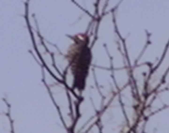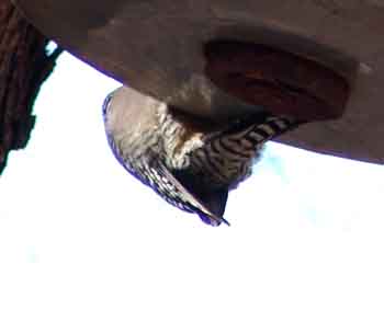 One of our most strikingly beautiful birds, this woodpecker shares with its close relative the Northern Flicker (Colaptes auratus) a distinctive oval patch on the breast and a red malar streak in the adult male, visible on the bird below left; note also the distinctively yellow line along the edge of the primary feathers of this bird. The two images below also illustrate (best seen in the enlargements) another characteristic feature of woodpeckers: their "zygodactyl" feet, with two toes forward and two back -- see below right -- but when climbing the stance rotates to an "ectropodactyl" arrangement, with the outer rear toe rotated to the side as seen below left. (See Sibley 2001, p. 377)