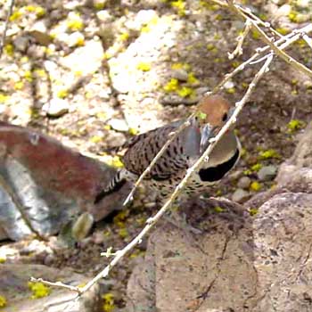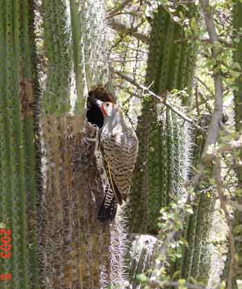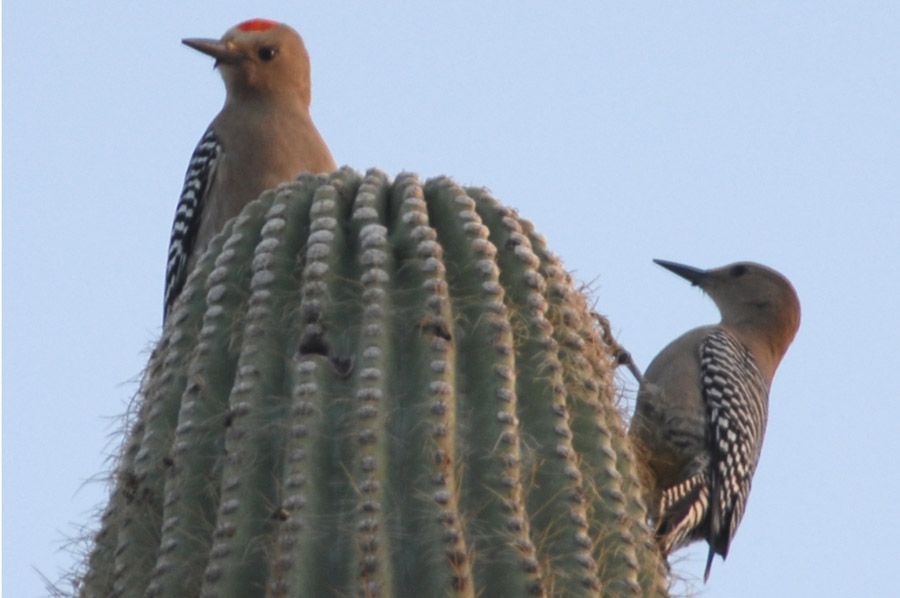 The Gila Woodpecker lives in closer association with saguaro cacti than do the Flickers (who we tend to see in more mixed-woodland terrain). They typically nest in saguaros. Below, a male (left) and female (right) Gila converse atop a familiar saguaro on April 8, 2008. Here the faintly reddish hue of the male's facial and breast feathers is intensified by the setting sun (it was 6:45 pm).