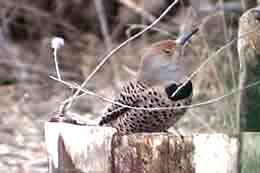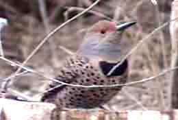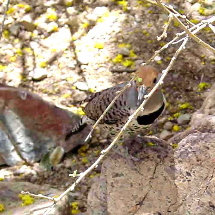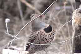 Flickers are large relative to other woodpeckers, and they often move to the ground to eat ants. They have white rumps, visible when in flight.