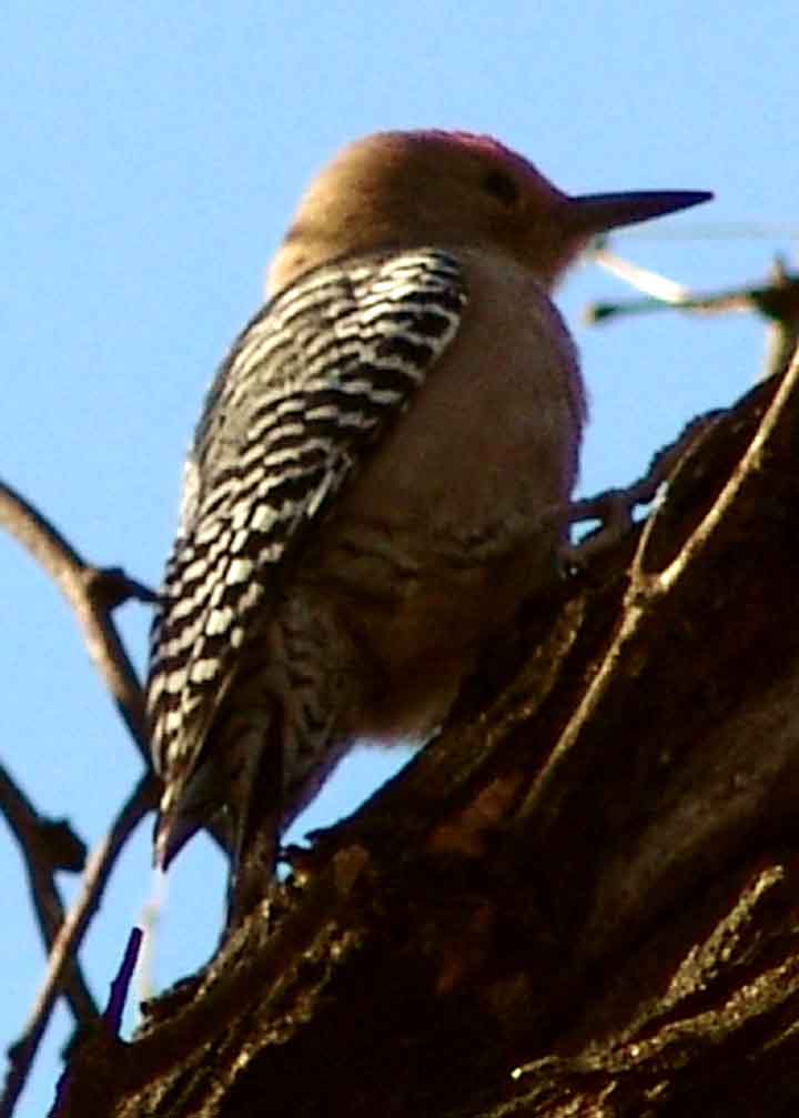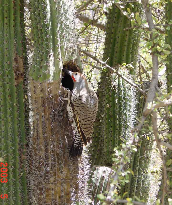 All woodpeckers have distinctive features adapting them to their work and lives on the edges of trees: stiff, propping tails that assist their creeping up tree sides and stout, chisel-bills for wood-drilling. Their flight patterns are deeply undulating, typically flying from tree to tree. (In our area, it's often from saguaro to saguaro.) They have strong contrasting colorations, and usually the sexes differ in head color patterns. Woodpeckers also have very long tongues, which are usually barbed and sticky to facilitate capturing insects hidden inside wood.
