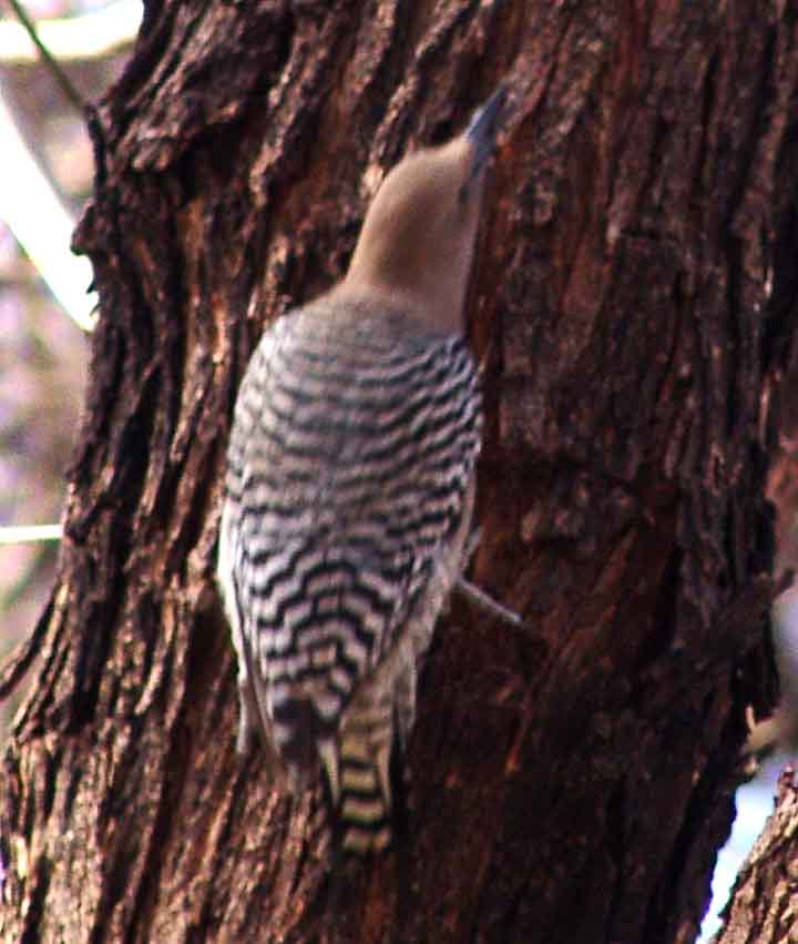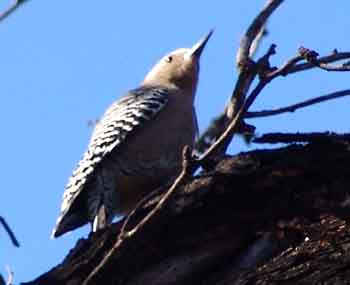 We photographed this female Gila Woodpecker below in Lower Hot Springs Canyon in February 2006. The head and the belly are this distinctive tan color (with a red patch on the crown of the male). The back and the tail are black-barred against white, and this barred pattern extends down the rump onto the upper legs. Note in the image at bottom left how the stiff woodpecker's tail serves as both a balancer and a brace when the bird is climbing (in this case, around a sharp-edged overhang). Click on each image to enlarge it.