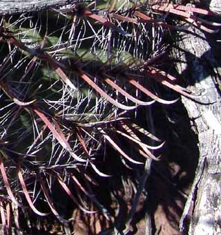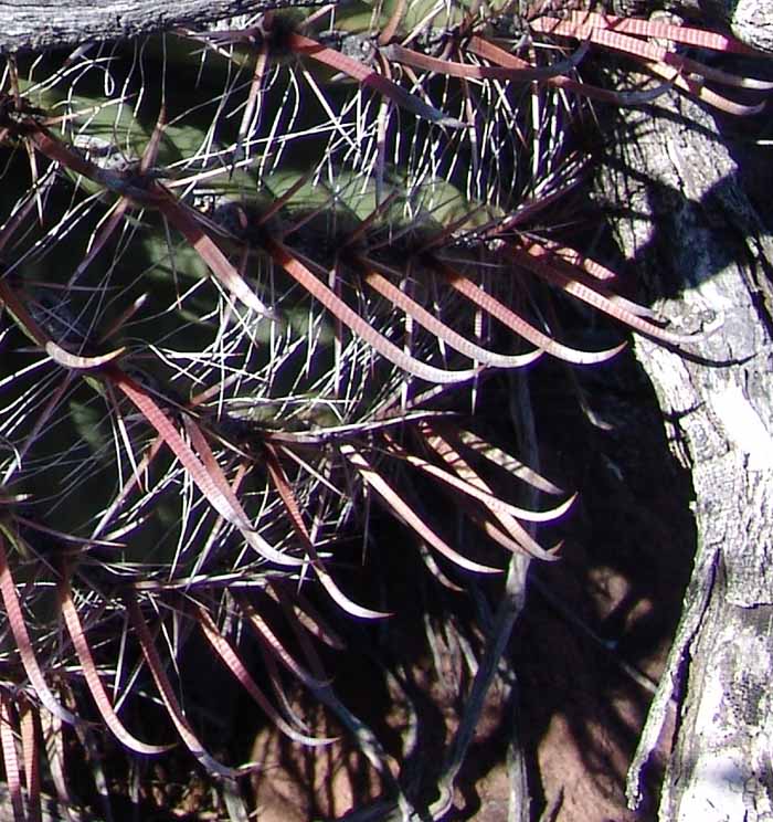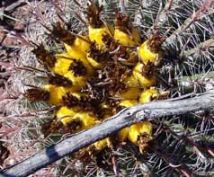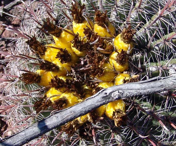 This barrel cactus is widely distributed, both in the Chihuahuan and Sonoran Deserts, from Pima County in the north to Sinaloa, but its greatest concentrations are in our region (hence one popular name is "Arizona Barrel"), where it's found to 4,500' elevation. They appear to be especially numerous in our Northeast corner, where the elevation is around 4,000'. The Fishhook Barrel begins life in an almost spherical shape (for example, below left), becoming more columnar with age (below right), and tending to lean toward the southwest side because of faster growth on the shady side. Its massive stem (with 20-28 ribs) is often somewhat obscured by its spines. Central spines are often red, shading to gray, and the radial spines are bristlelike and gray. Flowers bloom by day, colors are highly variable, ranging from yellow to red. They produce yellow, barrel-shaped, scaly fruit, which lasts all year and is eaten by deer and rodents (and see also below). Slow-growing, large plants may be over 100 years old but may topple after heavy rains due to the leaning described above.