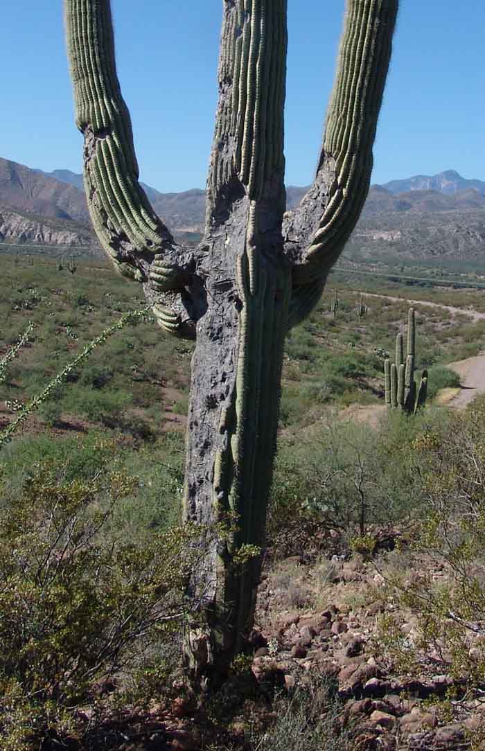 On September 24 (nearly two weeks later), we returned down the same trail, to see the same saguaro, shown at left, has lost both another of ts arms and the top of its central trunk. Click on the image to enlarge it.