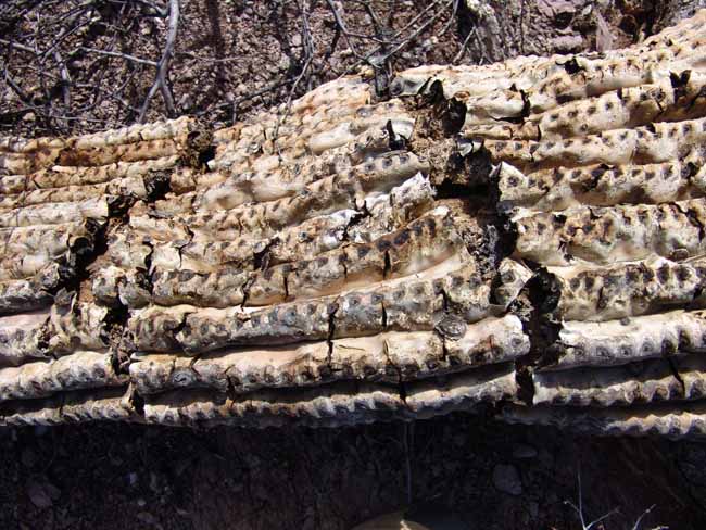 Another kind of injury occurs when a Cactobrosis Moth (Cactobrosis fernaldialis) lays its egg at the base of a Saguaro flower, and its larva burrows its way into the body of the plant. This larva proceeds to eat its way down through the cortical tissues of the tree (feeding on rot its associated bacteria produce), eventually exiting some place in the trunk. It leaves a roughly circular exit hole, evident in the image at far left, and the larva then pupates in the crevices between the flutes of the tree. The Saguaro protects itself even as the larva proceeds, building a small elongated boot-like protective structure, a portion of which was found here beside a recently fallen tree. (Click on each of the images to enlarge them.)