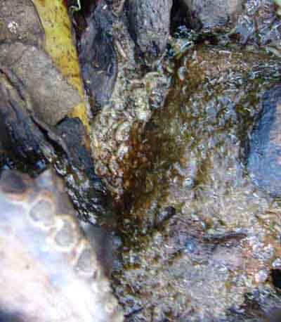 If you look closely at the left-hand image above, you'll see that the trunk is glistening -- it was actually running liquids, very very slowly. The smell was almost overpowering -- not exactly repulsive but certainly very strong and unique (unforgettable). The waters were thick all around the basal area, and they look like they're flowing, but -- as you can see in the image below, it's really myriad maggots feeding on the gooey mix, many thousands of them churning things up and making a collective sound like running water. (Click on the image to enlarge it.)