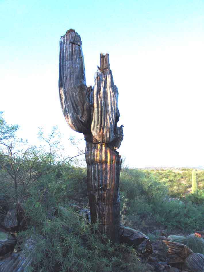 Below, on July 08, 2006, almost two years after the lightning strike, the first saguaro has now become an almost elegant skeleton (while its mate to the left has fallen). (Click on the image to enlarge it.)