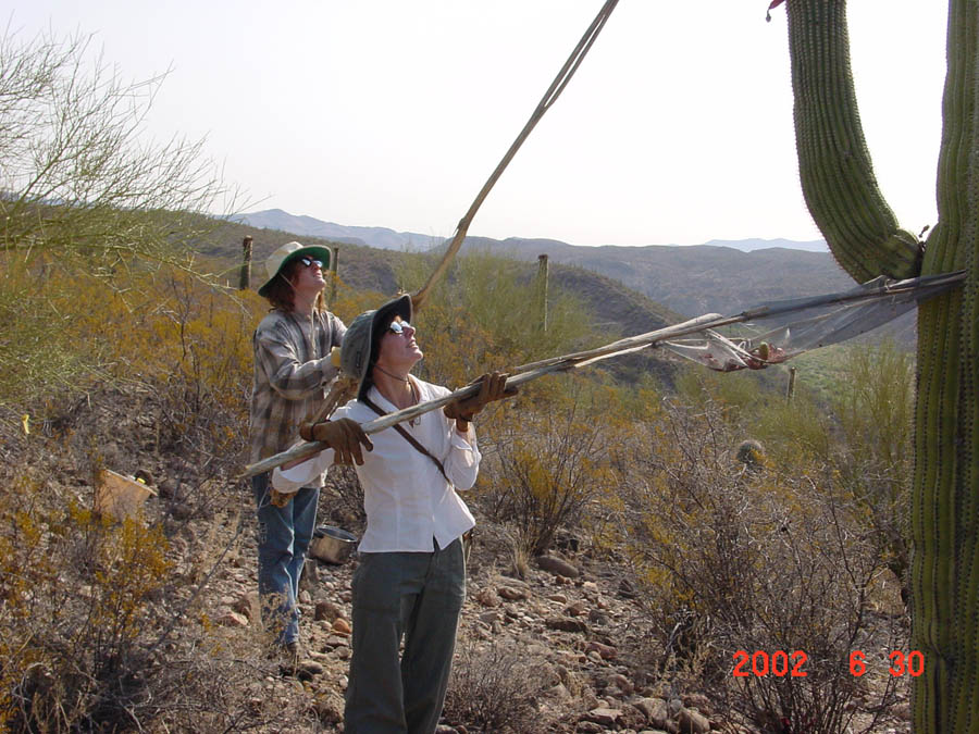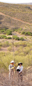 Armed with David Omick and Pearl Mast's recommendations, a group of Saguaro-Juniper Associates and friends set forth into the hills to capture Saguaro fruits. That's Kevin Henderson and Anne Helwig at left, armed with the O'odham huipaD, the instrument used to dislodge the fruits from high up. This very long series of lashed-together saguaro ribs has a crosspiece near the top to aid in loosening them. (Click on the image to enlarge it.)