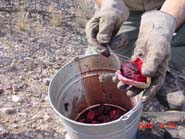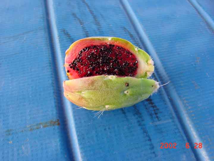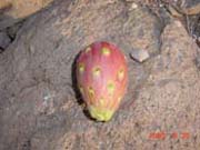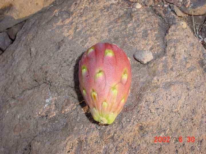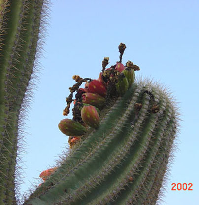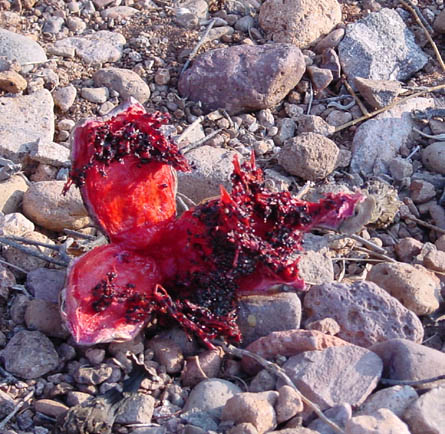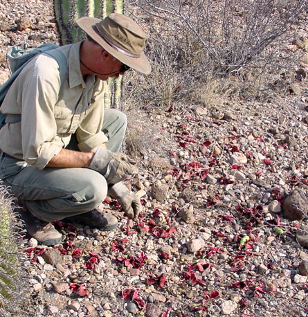 Below left, David Omick checks out an array of ripened, open fruit that has already fallen to the ground. Note in the image at right that even in the fallen fruit shells, some main fruit body remains stuck to the calyx. In a typical year we would ignore such fruit because it often contains tiny rocks from the fall, and insects quickly swarm over the droppings. However, this year (spring 2002) has been so dry that almost no insects or other animals have contaminated the fallen ones, so when we find fairly fresh and obviously clean fruits on the ground or in bushes below the saguaro, we may take them into the pot. It's a judgment call -- in four hours work, we saw only two fruits with larvae of some kind in them. (Click on each image to enlarge it.)