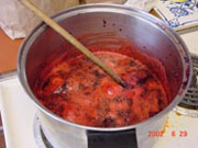 We then set the screen-load near the ground, and begin cutting open the ripe fruits and removing the core from the calyx with a spoon, dropping the core directly into the bucket. Below left, a "perfect fruit"; left-center, a cut open fruit; right-center, spoon-work; right, cooking pulp. (Click on each image to enlarge it.)