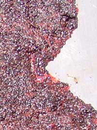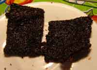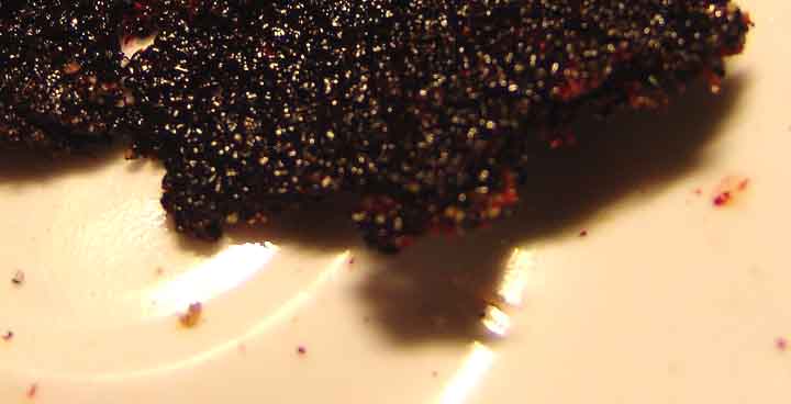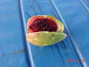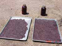 You can get a sense of the size of the black seeds scattered on the inner edge of the freezer jar at left. The taste of this natural sorbet is very difficult to describe, it's "indescribably delicious", the seeds crunching like poppy seeds in cake, and the pulp very rich in a unique sweet flavor. Daniel Baker's drying pulp (second from left) looked almost black while drying out in the mid-day sun (this photo was taken in later afternoon), and the cookie sheet was very hot to the touch. The closeup (second from right) shows how densely the seeds are distributed. This dried product had the texture of a pliable fruit bar, and was, again, indescribably delicious, both faintly crunchy from the seeds and chewy. At far right, here is the same product in July of 2005, again done by Daniel and photographed in artificial light. (Click on this image for a seed close-up.) These bars were also delightful to eat.
