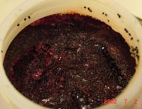 We boil the pulp for maybe 20 full-bubbling minutes, mashing the pulp with a potato-masher or multi-slotted spoon until the pulp is even in consistency and as non-lumpy as feasible, and then freeze it in a plastic jar (left, below) or preserve it in mason jars (if the latter, the mix should be "canned" immediately). Another option is cookies: Daniel Baker spread part of his cooked harvest out onto cookie sheets and set them in the sun to dry (center two photos, and far right).