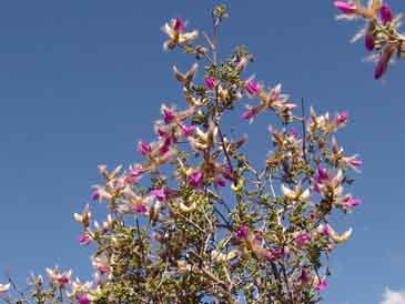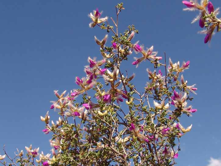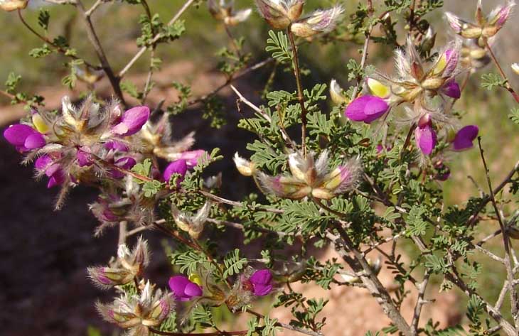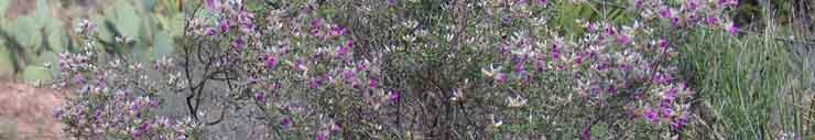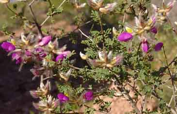 Dalea is a perennial member of the Pea family -- the same leguminous group that host most of our larger Sonoran Desert trees. This small bush sprawls to about 4 feet in height, and is not common on our lands, but occurs in widely scattered locations. These photographs were taken near the edge of a very small wash near the Notch Camp on April 08, 2004. The leaves are pinnate and grayish green (click on map below-right to get a better view), the flowers distinctly pea-like, with purple upper petals, whitish below.