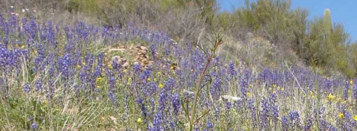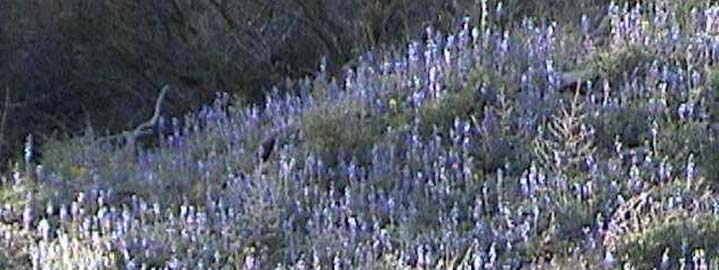 Banner images at top and bottom show Lupine fields on the flanks of Lower Hot Springs Canyon in March of 2001.