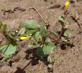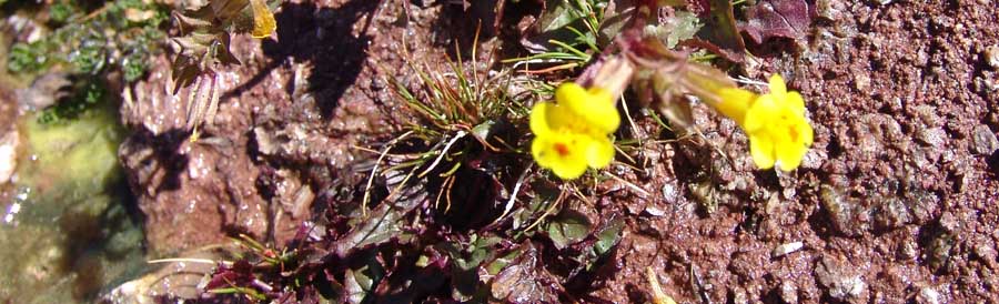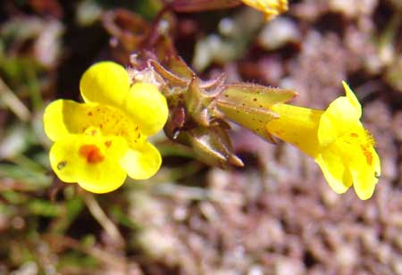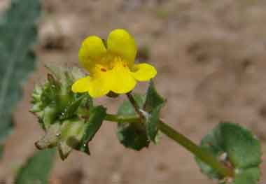 Note, in the banner image above, the standing water at the left edge of the image. Monkey Flower, also called "seep-spring monkey flower", consistently appears in wet places (in this case, in the substantial seep flowing below the rain-filled Red Tank in March 2007). Below left, a view of the leaves, which are dark green, opposite and oval, with toothed margins; below right, close views of the flowers, which as Epple (1995:229) points out, show the "2 lobes of upper lip point[ing] upward, 3 lobes of lower lip point[ing] downward"; length is to 1 1/2" long. Click on each image to enlarge it.