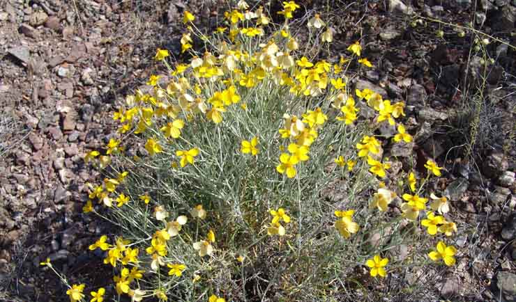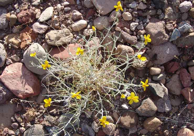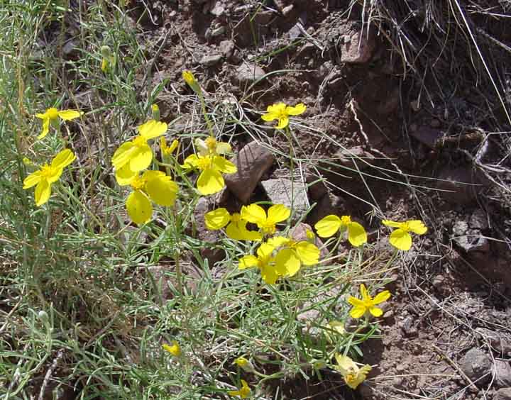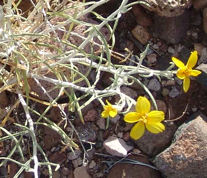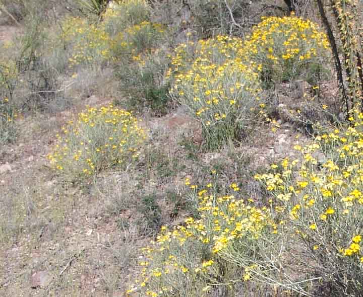 Like Brittlebush, Paperflower when blooming presents a striking hemisphere of color, but its leaves are less prominent. The flowers may appear at various times of the year, and they persist for some time, gradually fading from their bright, pure yellow color and become more and more papery in texture. Below left, a field of them blooming along the flanks of the Pool Wash ridge road in May 2004; below right, a closer view of the flowers, these blooming in August of 2003 in the West Wash of Lower Hot Springs Canyon. Click on each image to enlarge it.