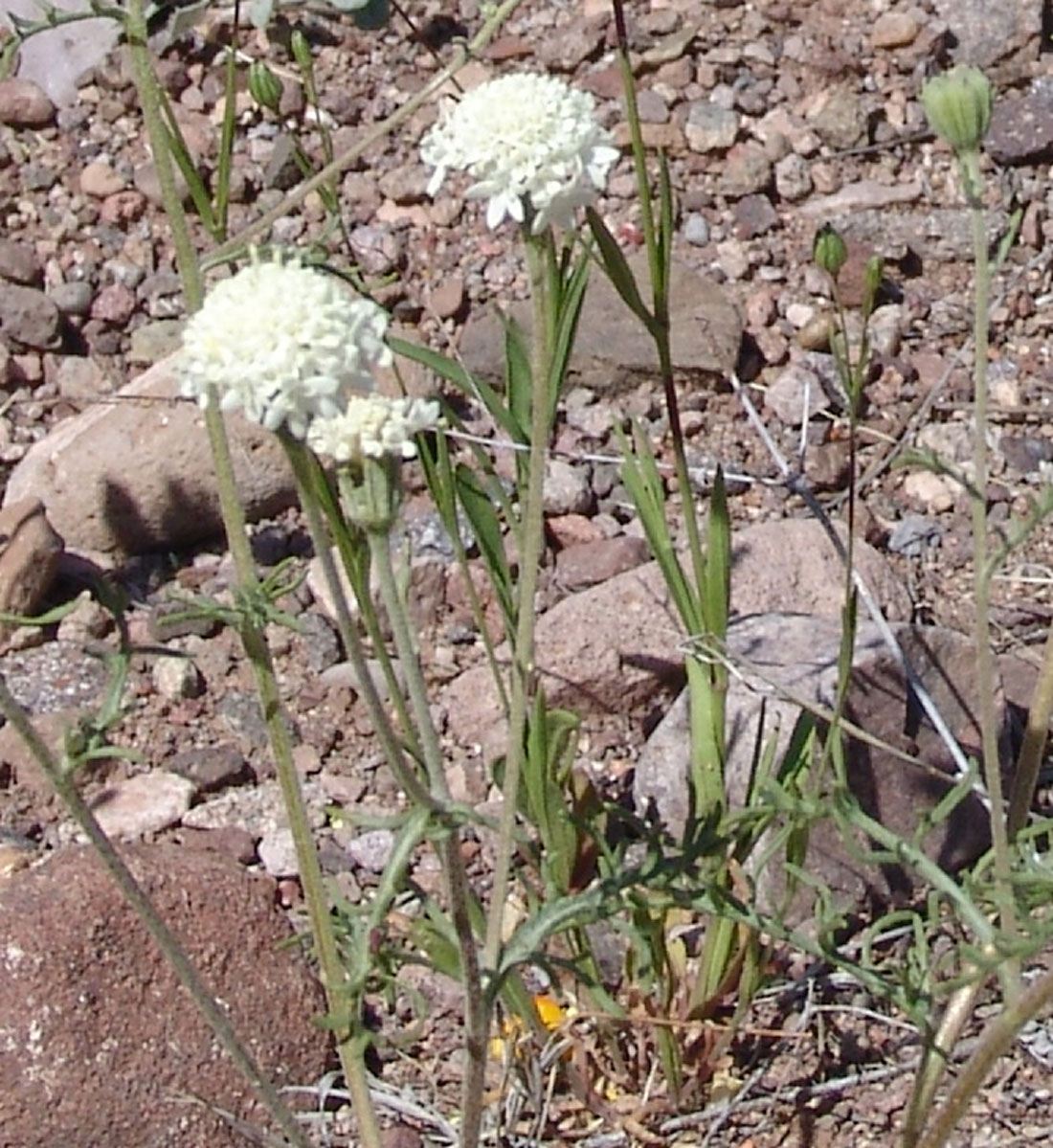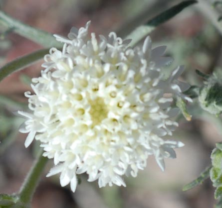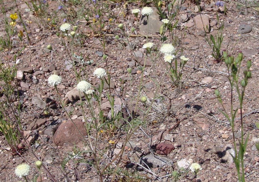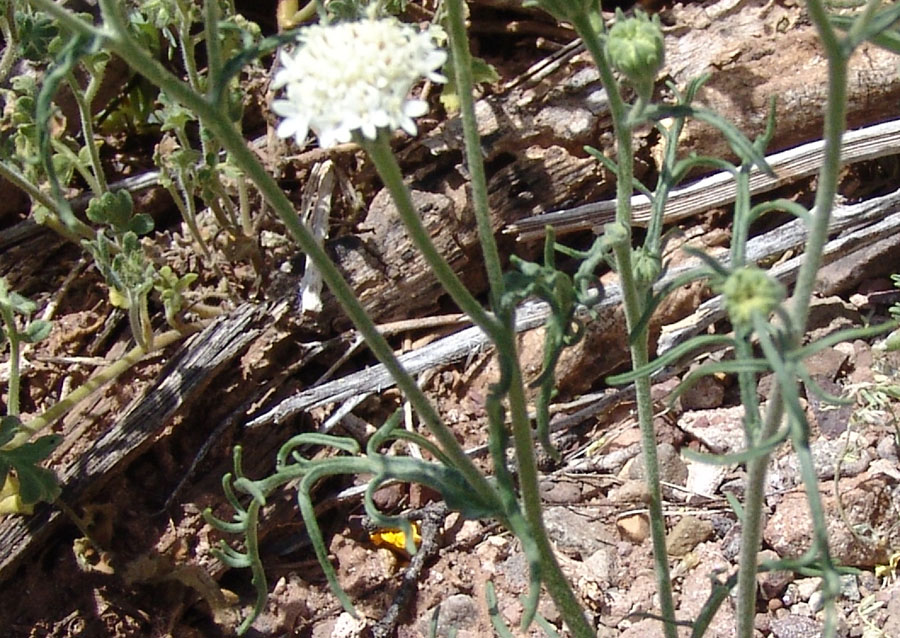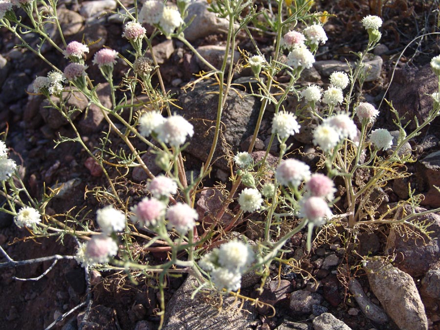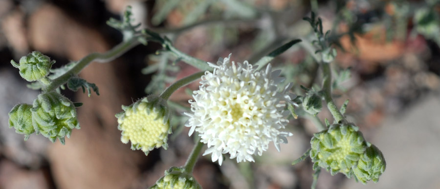 The flower above was photographed in lower Hot Springs Canyon on March 6, 2008. Six species of Chaenactis are known in Arizona. Epple (1995, pp. 264-5) describes two of them, and we will tentatively distinguish them as evident here, based on leaf differences. The flower above, and the plants directly below (flowering on March 27, 2004 in Hot Springs Canyon) appear to fit the leaf pattern of "Esteve's Pincushion" (Chaenactic stevioides) in having "grayish green, woolly [leaves], divided twice into many short, thick, very narrow segments":