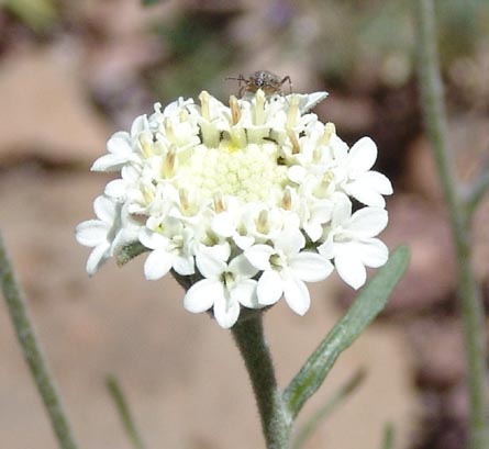 In contrast, this stand of pincushions below, photographed on March 28, 2004 in another location of the same area, displays leaves that fit Epple's criterion of "Green [leaves], divided into linear lobes; to 3" long": (click on the image for a clearer close-up)