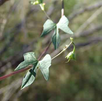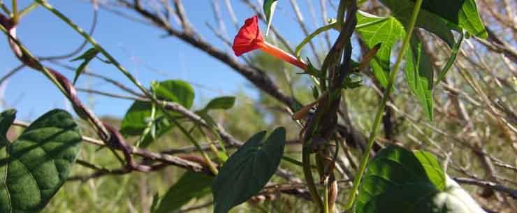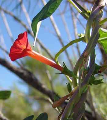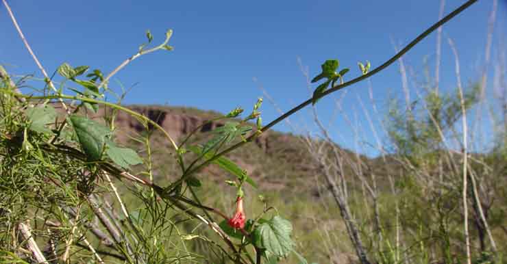 Scarlet Creeper is a long, twining vine which appears rather suddenly in our washes after good summer rains. The ones photographed here were seen September 9, 2004, after several moderate floodings of the Hot Springs Canyon Wash. Young vines of both these plants and Morning Glories were growing up in many locations along the wash.