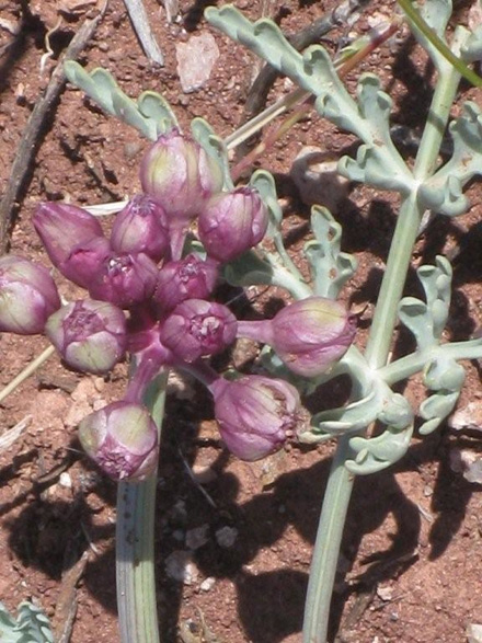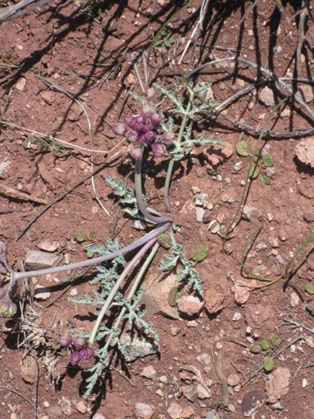 On March 24, 2010, Nancy Ferguson, Tom Orum, and Elaine Nakash encountered this plant near the Red Tank, east of Sierra Blanca Canyon Wash. "Cymopterus multinervatus is a species of flowering plant in the carrot family known by the common name purplenerve springparsley. It is a perennial herb native to the southwestern United States, including the desert regions. It is stemless, producing leaves and inflorescence at ground level from a taproot. The leaves are erect on petioles of a few centimeters in length, with a fleshy blade dissected into waxy multilobed leaflets. The inflorescence arises on a stout purple or greenish peduncle up to about 14 centimeters tall. At the top is a rounded cluster of purple flowers sheathed in purple-veined bracts." [This text is copied from a Wikipedia source. See this link and click on "Photo Gallery" for more images: Cymopterus multinervatus.]