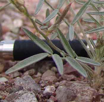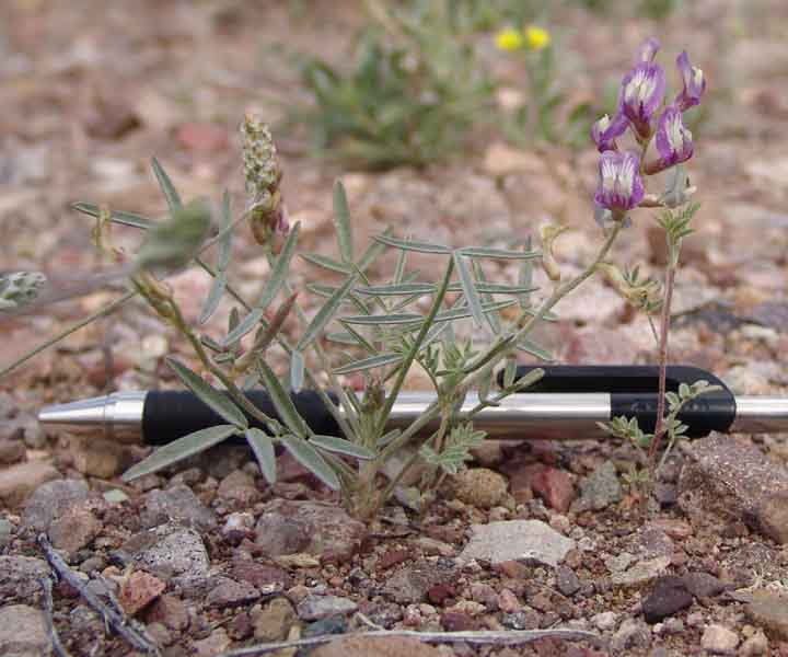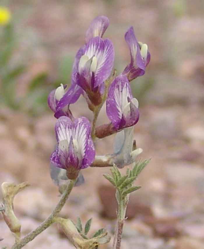 Vetch is a member of the Pea Family (Fabaceae), and its species are more typically found in the mountain pine forests of our Southwest, but this plant is blooming in April of 2004 along the Ridge Road of Pool Wash at an elevation of about 3,900 feet. This plant has dark blue-green pinnate compound leaves, each leaflet being rather narrow and lanceolate, without bristle tips, and the leaf lacks a tendril. At the base of each leaf-stalk there are narrow, sharp wings. The flowers, which are multiple, lavender-white and pea-like, are blooming early in the year. The images below provide some closer indicators of features that may aid in identification, click on each image to enlarge it: note the pair of wings at the leaf-base in the small plant at the right in the right-hand photograph