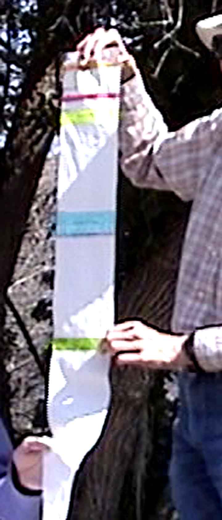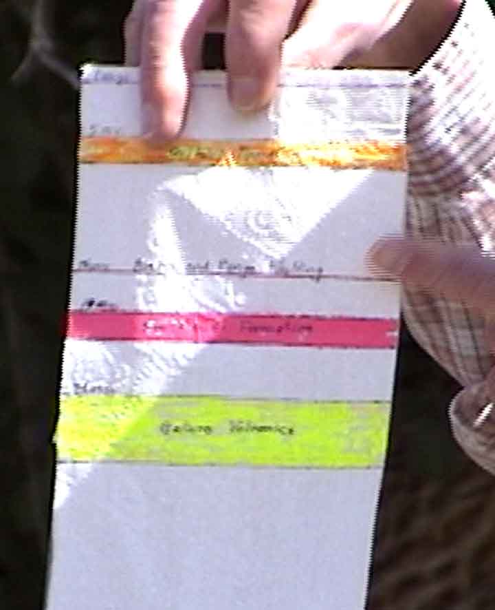 In the picture above left, Mick began by equating each sheet in the roll with 20 million years, thus a full roll of toilet paper -- if it had 225 sheets rather than 200, as this roll has -- about equals the total age of the earth (about 4.5 Billion years). In the middle picture, Mick observed that the time of the first modern Homo Sapiens (say 100,000 years) cannot even be shown on the edge of the first sheet of paper, while the past-time appearance of the first human beings, about 1 Million years ago (1 MYa), is represented by the narrow dark line beneath the nail of Mick's index finger (upper-right at the top of the sheet. Click on the image to enlarge it). The Quiburis Formation of our area, which runs from about 7.5 to 5 million years ago (MYa), is represented by the orange strip at the tip of his leftmost finger in the image. This is roughly the time when the ancestors of human beings separated from the Great Apes (most closely, the Chimpanzee / Bonobo group). Further down the sheet, the narrow dark line running just below the finger on the right side of the paper represents the time of the Basin-Range Block-faulting that produced the HSC topography of today, which began around 15 MYa. Below that, the broad red strip represents the San Manuel Formation, deposited about 20-18 MYa (about the end of the first toilet-paper sheet), while the even broader yellow band represents the Galiuro Volcanics, which is just a short ways into the second sheet of toilet paper, about 25-24 MYa. In the right-hand picture (Click on the image to enlarge it), Mick shows the two other main formations to be seen in Hot Springs Canyon, the Cascabel Formation (shown in blue, at 70-65 MYa), and the Willow Canyon Formation (shown in green), which is about 6 sheets of paper down from the top, at 120 MYa (Lower Cretaceous in age).