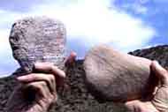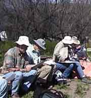 Since 2001, we have used "Geology Walks" led by experts to help ourselves and other members of the lay public better grasp the long-term significance of the land forms in our area. Beginning in March, 2001, David Omick and Pearl Mast, as leaders of the Cascabel Hermitage Association Educational Program, organized the first Hot Springs Canyon Geology Walk, which was guided by Norm (Mick) Meader, a Saguaro Juniper Associate who is also a professional geologist (an Administrative Associate in the Department of Geosciences at the University of Arizona), and Robert Scarborough, then Geologist for the Arizona-Sonora Desert Museum. Bob and Mick provided such a stimulating and informative experience that we have since organized further walks, and plan to continue this in the future.