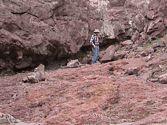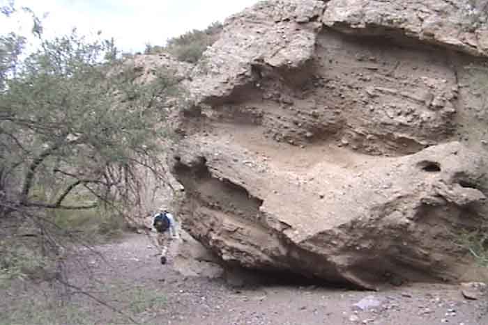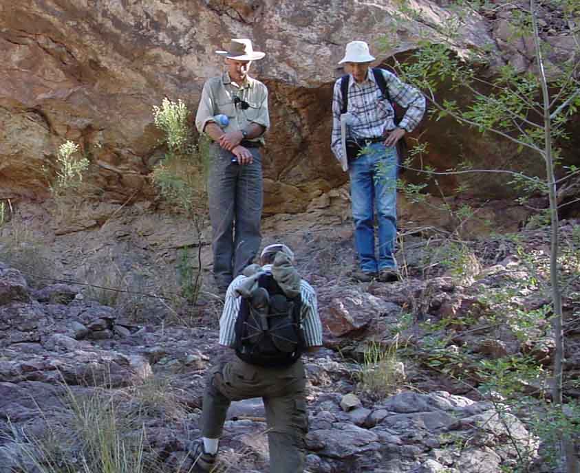 Conglomerates are very widespread in the Cascabel Formation in our area. Below, during the November 2002 Geology Walk, David Omick and Mick Meader (rear left and right) stand in front of the the meeting-point of Willow Canyon and Cascabel Formations, their knees roughly marking the boundary. Above is Willow Canyon mudstone; below is Cascabel conglomerate.