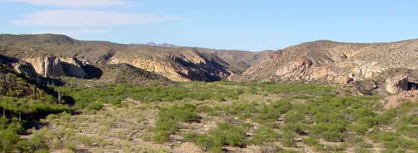 The widely separated canyon walls present a different appearance from these black rocks in the alluvium: Two characteristic cliff formations flank both sides of the lower canyon at and near the Rabbit Ears Saguaro Hill. (For map orientation, see Hot Springs Canyon Map.)