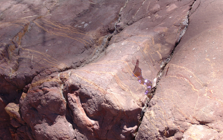Here below are two further bedrock examples from close nearby, on the left a remarkably tiny whole-circle twist of the rosy-brown [RGB] mudstone (size indicated in relation to the prickly pear pads nearby), and on the right an outcrop of yellow-streaked rosy-brown mudstone. Many clasts of this latter stone stand out visually when seen in alluvial deposits further downstream. (Click on each image to enlarge it.)