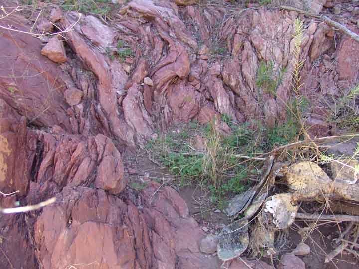 Long after the Willow Canyon formations were laid down, they were intensely deformed -- tilted, twisted, compressed, sheared, etc. -- as part of being thrust-faulted to the northeast at an angle upward some 60 million years after their deposition, during the Laramide Orogeny, perhaps some 60 million years ago (see below). This formation is characteristically very reddish (hence, the "Red Trail"), and its strata extremely tilted, often twisted. Here is one view of its frozen torment, further upstream: