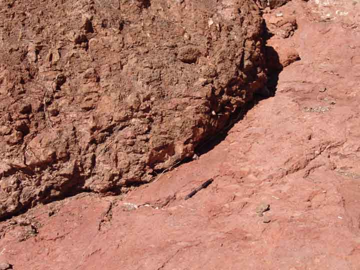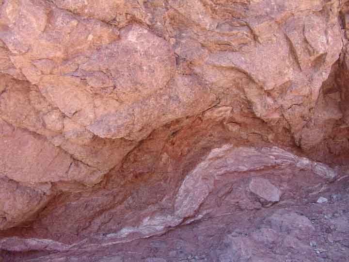 This fault, above, is apparently a major detachment fault, which has moved the overlying Galiuro volcanics several kilometers westward, in a massive "landslide" downward (to the left) over the underlying Willow Canyon formation, the surface of which has been much disturbed by this process. As Bob Scarborough observed while we walked over this surface, "It's all messed up." Here below are two closeups of the boundary: