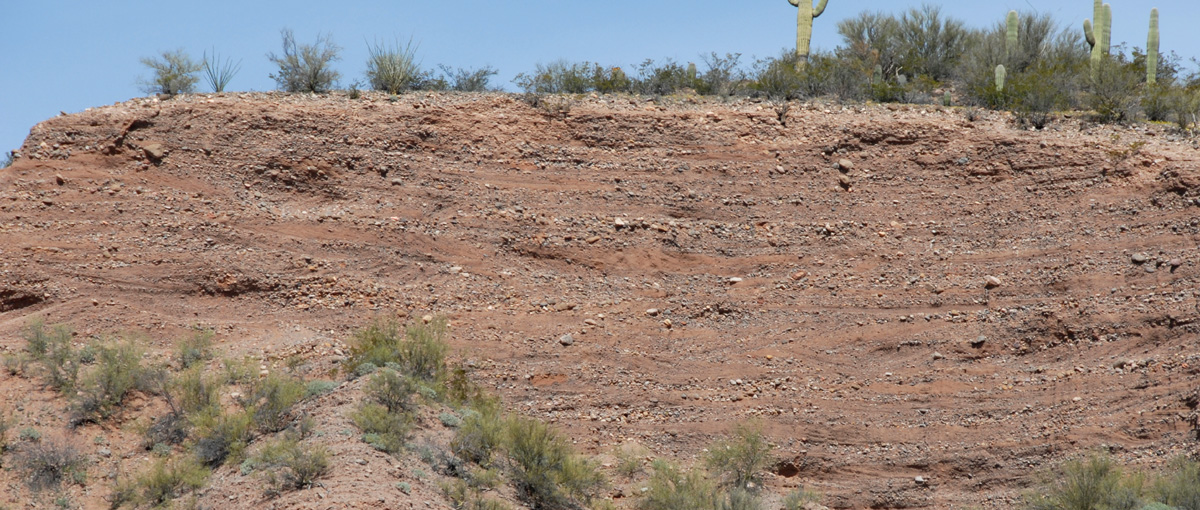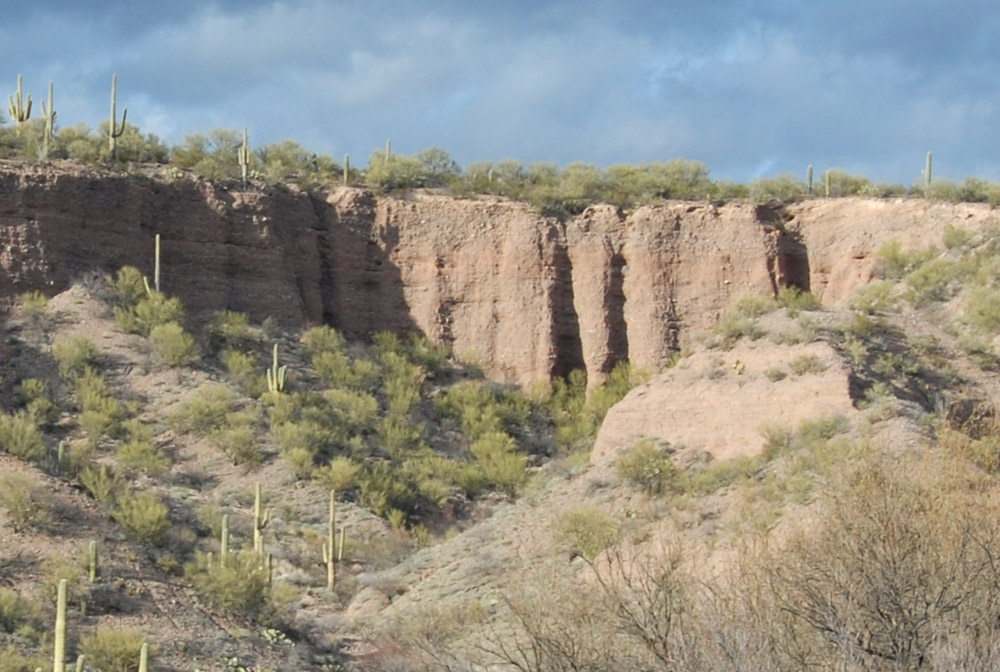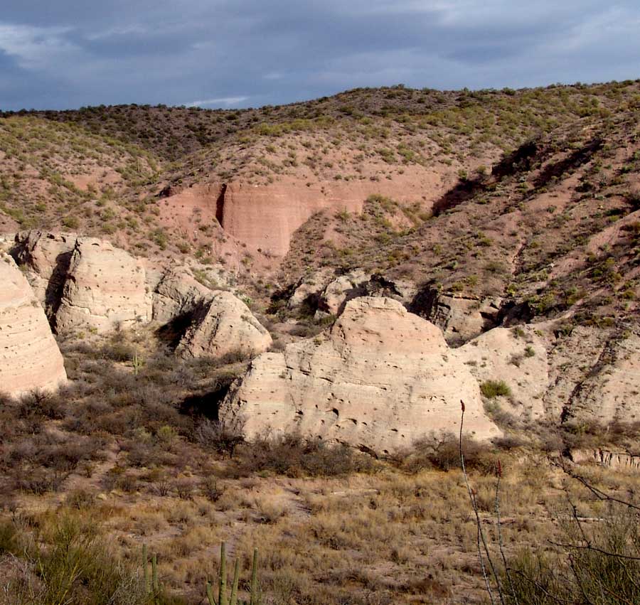 As you go up the Hot Springs Wash from the Windmill toward the Rabbit Ears Saguaro Hill (and our deeded land fence and gate), you walk along the low silty and gravelly terraces of the floodplain, which is stream alluvium being deposited during Pleistocene to recent times (the Quaternary Period, here much less than 1 million years old). Note the wide variety of cobble-to-boulder water-worn clasts lying scattered amidst the sands and silts of the floodplain. These have eroded from diverse rock formations located upstream.