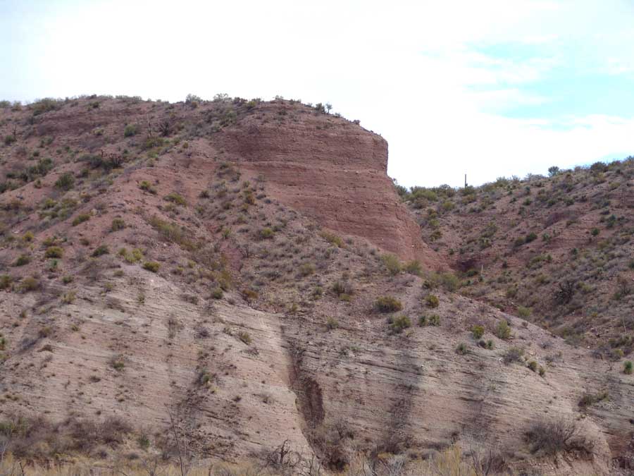 The thickness of Cascabel deposition suggests a deposition rate of probably about 100 meters thickness per million years during about a ten-million year period. Some of it looks similar to the Willow Canyon Formation, but it seems more diverse, appears to support richer vegetation than does the Willow Canyon (as does the Galiuro Volcanics), and contains some seeps and a spring on our land. (The Muleshoe Spring located just south of our boundary with the Nature Conservancy in section 3 is a fine example of this, and so is our Sierra Blanca Spring.)