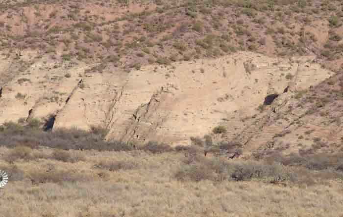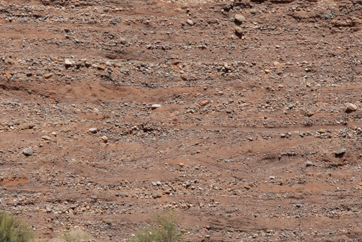 In this much closer image below, you can see interbedded layering of gravels and more clayey-silt deposits, lying as they were deposited during the alluvial construction of the great Soza Mesa bajada prior to 5 Million years ago.