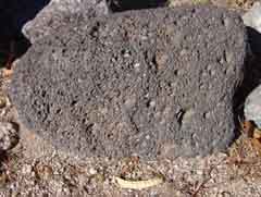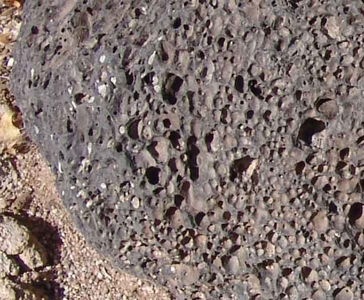 For example, at left, consider one of the many blackish, rounded river cobbles, some quite large, each densely vesicular (filled with many small holes, formed by gases contained in the volcanic magma as it cooled). These are basalt rocks eroded from a lava flow some millions of years ago the remains of which are found far to the northeast of our area, on the east side of the East Range of the Galiuros (see Galiuro Mountains), near the headwaters of Bass Creek (a major tributary of Hot Springs Canyon), located to the south of Bassett Peak. These large river cobbles are common in our Hot Springs Canyon floodplains because basalt is composed of tightly interlocking crystals that resist the poundings of waterflow, hence the rocks retain their coherence over long distances as they are gradually borne downstream.