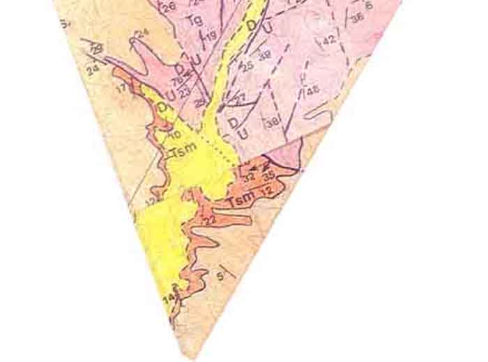 The Map below (adapted from Goodlin 1985 and Mark 1987, see Credits & Bibliography) shows the divisions clearly (click on the image to enlarge it) -- the Quaternary alluvium is shown in yellow, the San Manuel outcroppings [Tsm] in brown, the Quiburis overlying formation in beige, and the Galiuro Volcanics in pink. The Fault is faintly marked with a hard black line where directly visible, with a dashed line where it is buried under the alluvium.