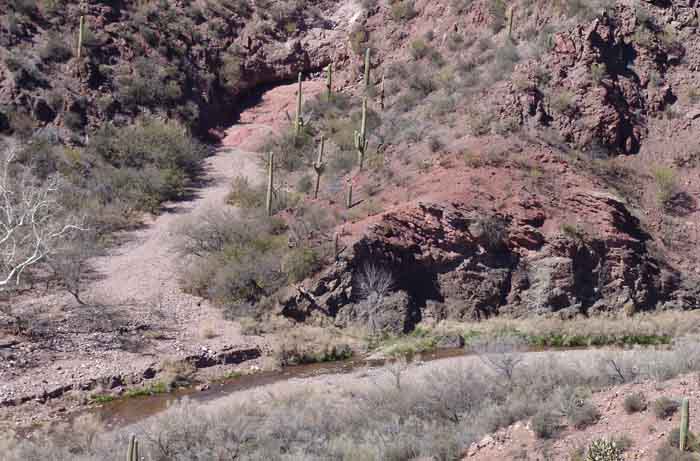 The Map below (adapted from Goodlin 1985 and Mark 1987, see Credits & Bibliography) shows the faultline clearly -- again, the Quaternary alluvium (which reaches its most upstream extent at this point) is shown in yellow, the Galiuro Volcanics in pink, and the Cretaceous Intrusive [Ki] in red. The Willow Canyon Formation [Kb] is indicated in green.