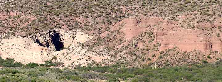 Second, just across the wash from Rabbit Ears Hill appear large outcroppings of an older Tertiary sedimentary formation, which underlies the Quiburis (as can be seen on both the east side of the canyon near Rabbit Ears Saguaro Hill and the west side further upstream toward the Cleft). These cliffsides are more sloping than vertical in shape (almost domelike in shape), mostly pale gray in color, with many small cave-holes. This is the San Manuel Formation -- a coarser, looser conglomerate mix of rougher pebble-to-boulder alluvium, and in part containing the volcanic tuff and ash produced during the earlier Galiuro volcanic mountain-formation to the east. It is much more strongly tilted than the later Quiburis complex which overlies it. In both images below, the contrast between pale (if somewhat striped) San Manuel Formation beneath and the sharply reddish Quiburis above it is clear.